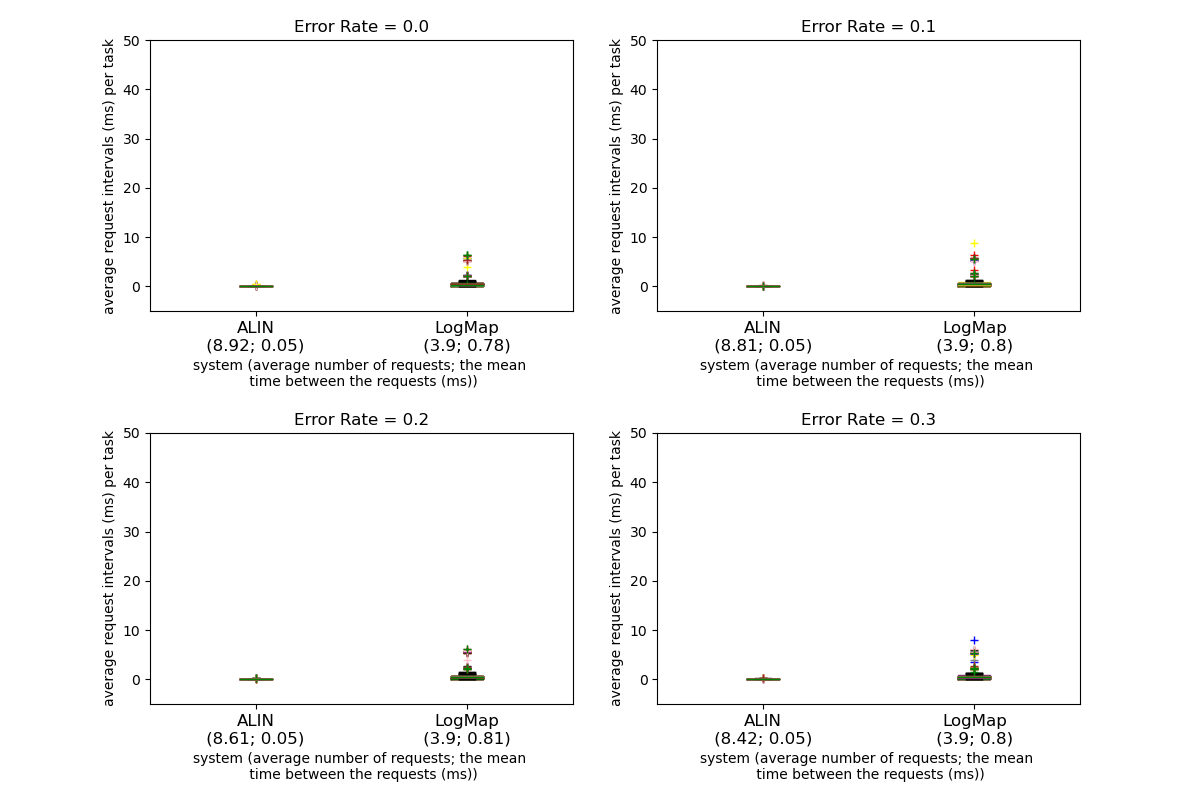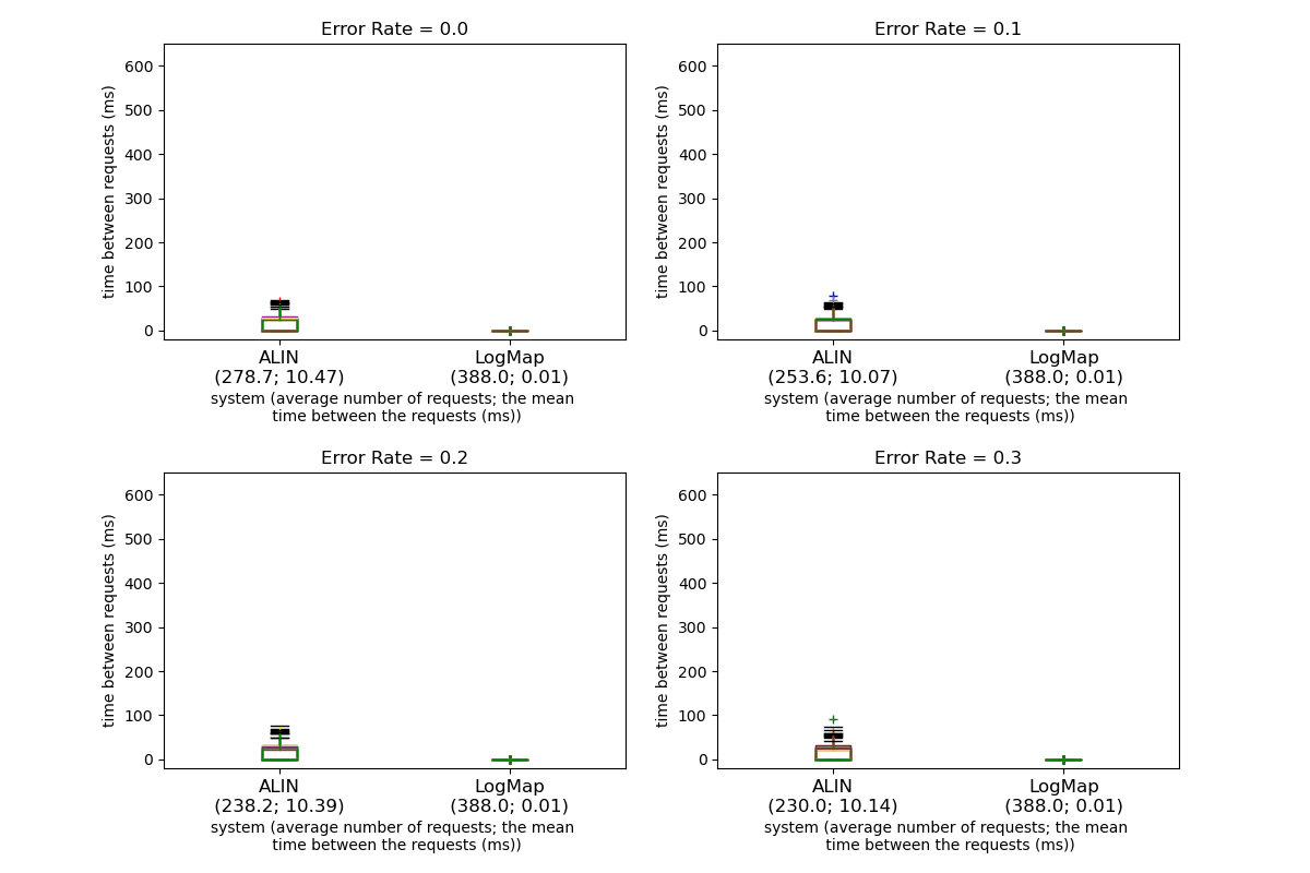 For an interactive system, the time intervals at which the user is involved in an interaction are important. Fig. 1 presents a comparison between the systems regarding the time periods at which the system presents a question to the user. Across the ten runs and different error rates, the LogMap mean requests intervals are around 0.01 ms. The average of ALIN's mean intervals is 10.26 ms. While there are no significant deviations of this value for LogMap, several outliers are observed for ALIN. For the run time between the different error rates, there is no significant change for LogMap and ALIN. LogMap generates alignments in less than a minute.